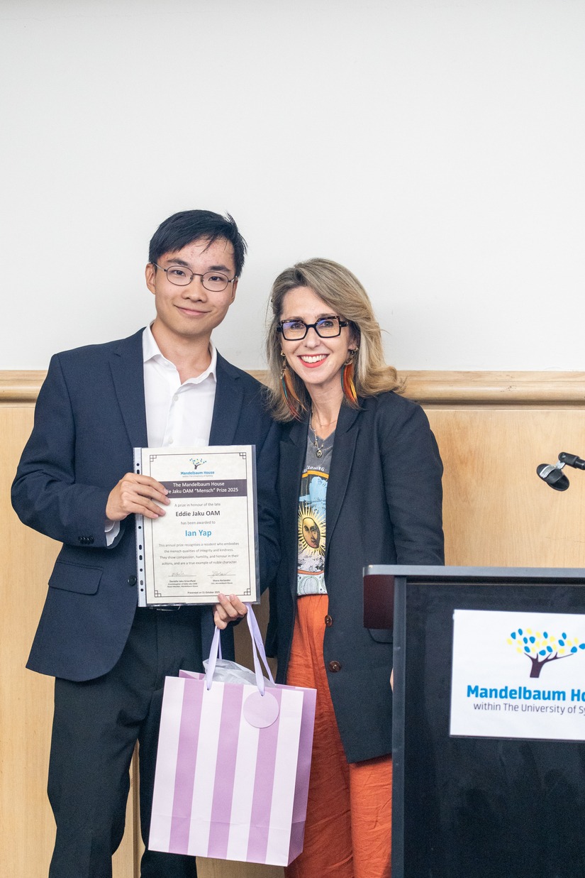 Danielle then took the stage to present the Eddie Jaku Mensch Award, created in memory of her grandfather to recognise a student who exemplifies integrity, respect, and kindness. Voted by staff and students, this year’s award was presented to Ian Yap, whose genuine character and dedication have made a lasting impact on our community.
